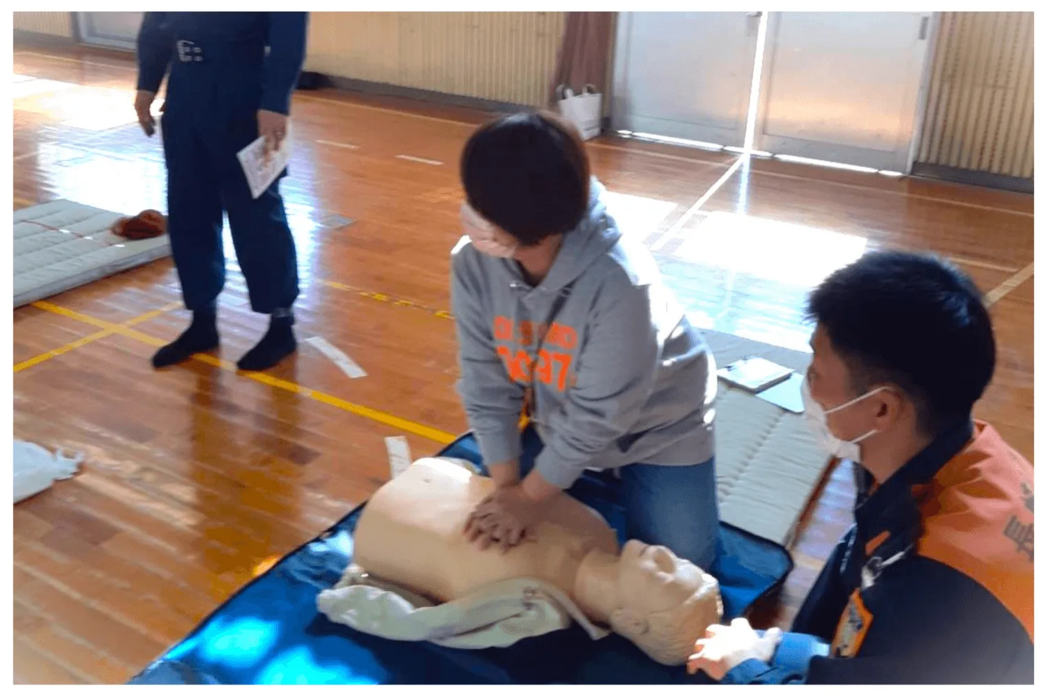 消防署の方に丁寧にご指導頂き、胸骨圧迫を体験しながら学びました