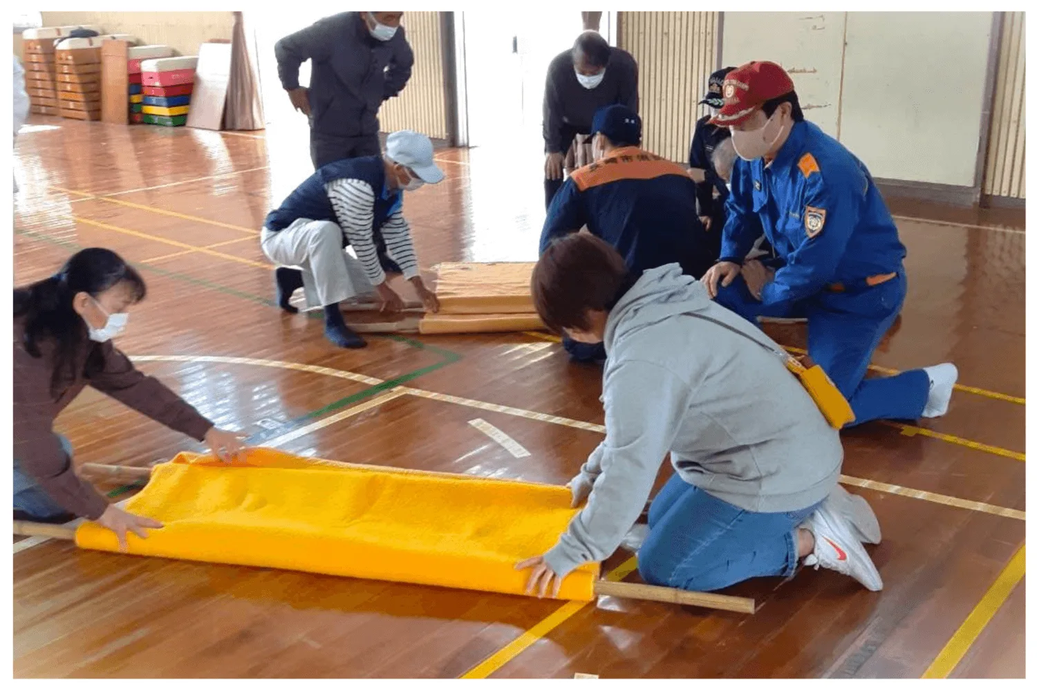 毛布を使用した簡易担架での搬送を体験しました。迅速に安全な場所に運びます!